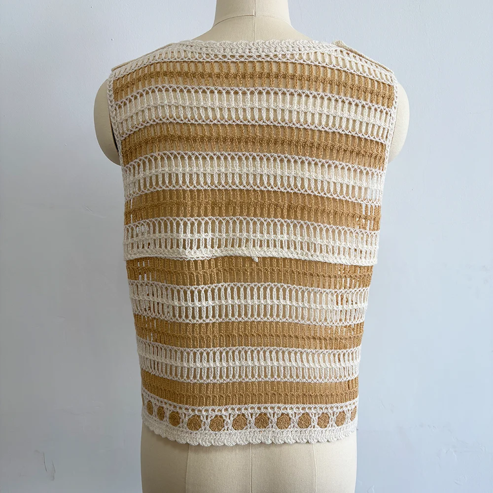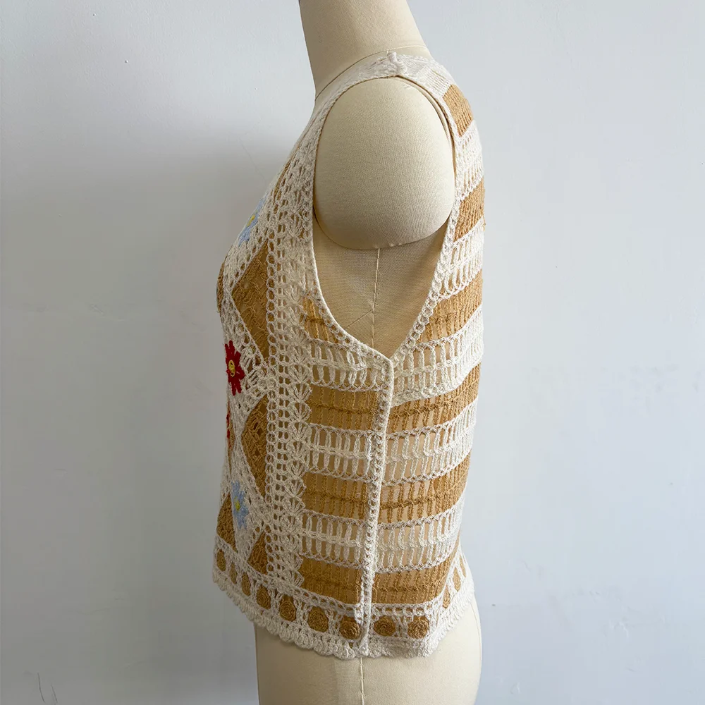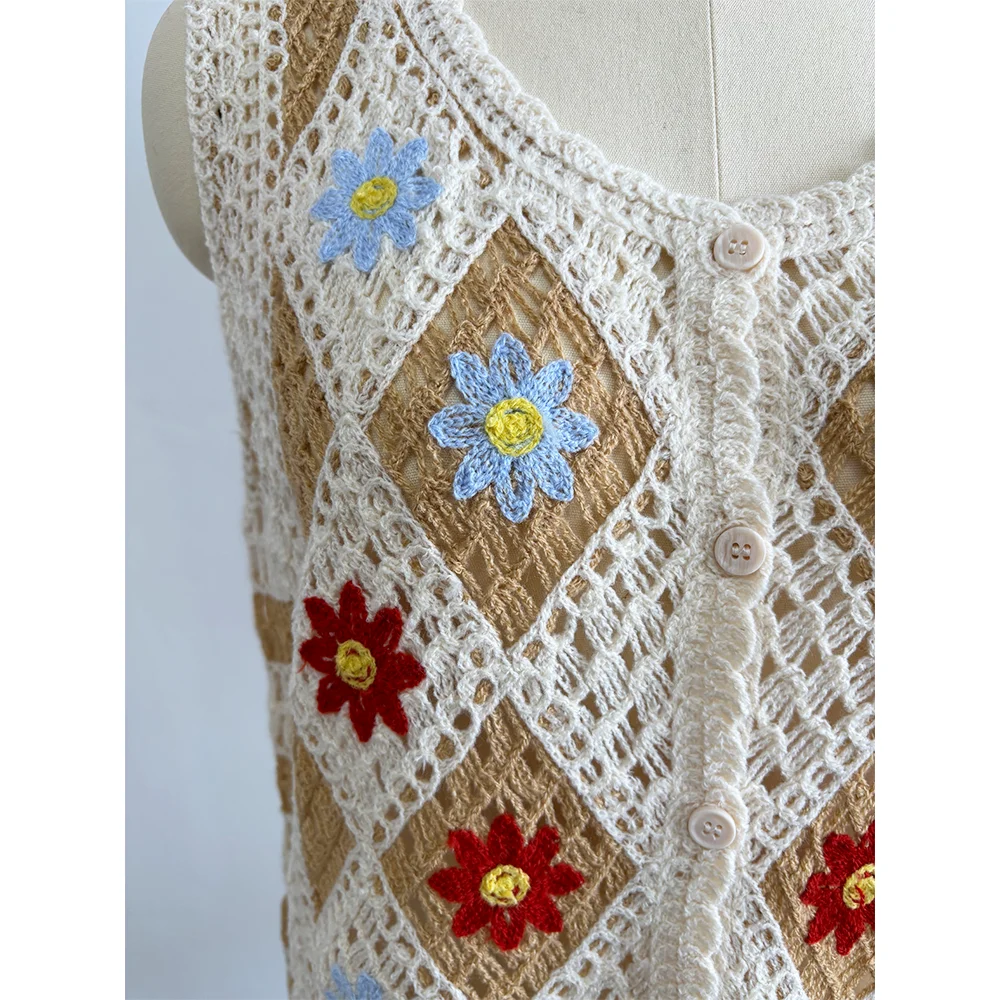 Women's Custom Spring Knitwear Casual Crochet Tank Top Vest with Hollow Handmade Flowers Front Logo Sleeveless Crochet Sweater